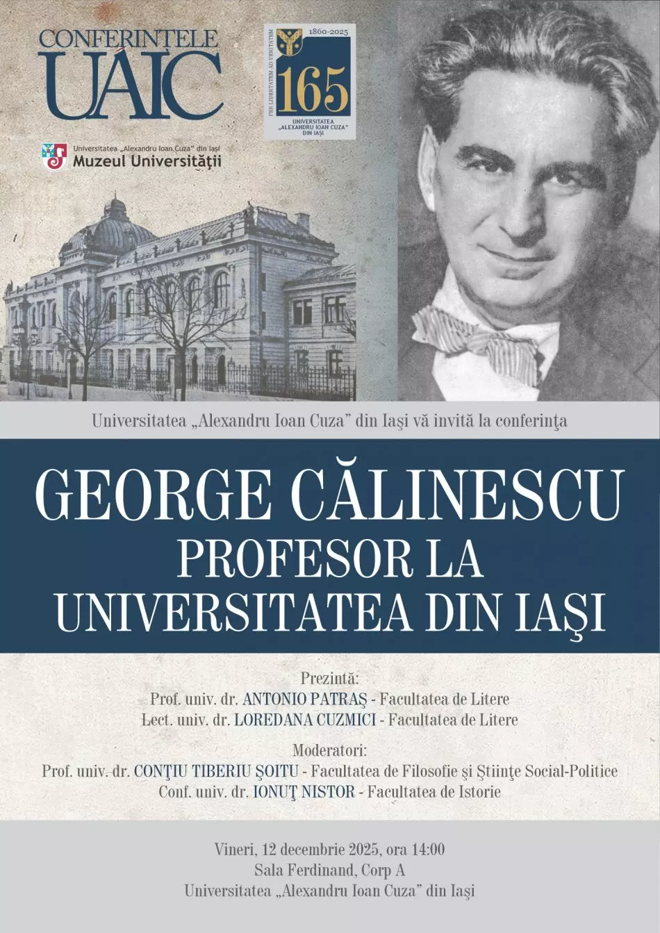Universitatea „Alexandru Ioan Cuza” din Iași (UAIC) organizează vineri, 12 decembrie 2025, la ora 14:00, în Sala Ferdinand a UAIC, conferința „George Călinescu, profesor la Universitatea din Iași”.