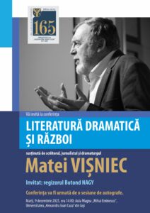 Universitatea „Alexandru Ioan Cuza” din Iași (UAIC) organizează marți, 9 decembrie 2025, la ora 14:00, în Aula Magna „Mihai Eminescu”, conferința „Literatură dramatică și război”, susținută de scriitorul, jurnalistul și dramaturgul Matei Vișniec. Invitatul evenimentului va fi regizorul Botond Nagy.
